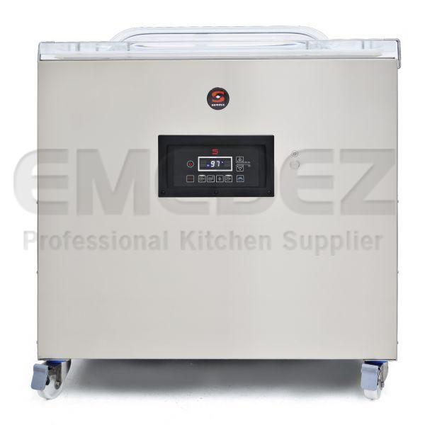 Masina profesionala de vidat model SE-806 din seria SE-line este realizata din inox atat la interior cat si la exterior. Masina de vidat este echipata standard cu pompa BUSCH si foloseste un sistem cu dubla sigilare pentru asigurarea unei ambalari durabile. Acest model este echipat cu panou de comanda digital , iar procesul de vidare este controlat de un senzor foarte precis sau microprocesor. Astfel timpul pentru vidare este cel optim pentru produsul ambalat , iar manometrul nu mai este necesar acesta fiind inlocuit cu un display care indica procentul de vidare. Masinile de vidat din seria SE-line se pot folosi pentru ambalarea lichidului deoarece permit reglarea unui procent de vidare pentru ambalarea lichidului la temperatura camerei fara a exista riscul de scurgere sau stropire.